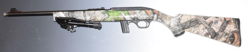 CBC Magtech Model 7022 .22 semi-automatic rifle with chequered semi-pistol grip, magazine, bi-pod, camouflage stock, adjustable sights and 18 inch barrel, overall length 94cm, serial number EAA070657.  PLEASE NOTE THAT A VALID RELEVANT FIREARMS/SHOTGUN CERTIFICATE IS REQUIRED TO HANDLE/PURCHASE THIS ITEM.