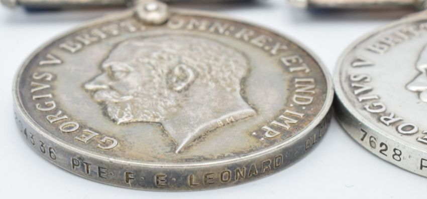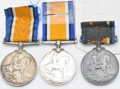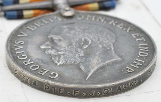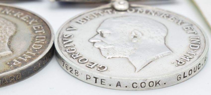 British Army WW1 medals comprising three British War Medals, named to 25514 Pte F J Clarke, killed in action on the 24th March 1918 at the Battle of Bapaume, 7628 Pte A Cook, born in Berkeley, Gloucestershire, died of wounds Salonica 3rd September 1918 and 204336 Pte F E Leonard, all Gloucestershire Regiment