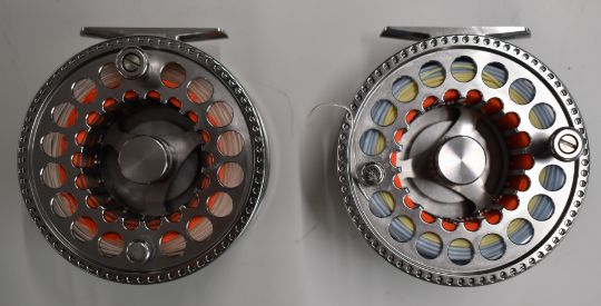 Two XDP X-Treme drag performance 10-11 fly fishing reels with lines, in soft cases