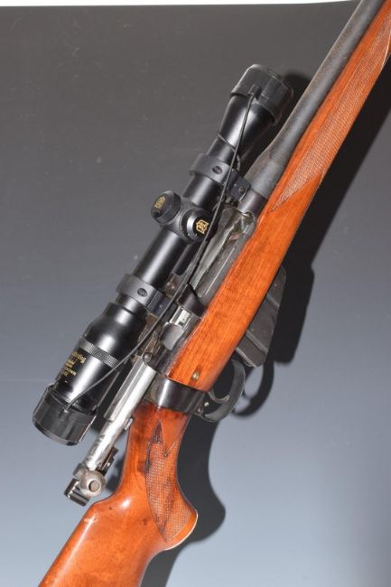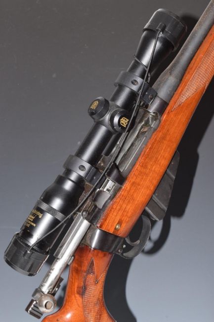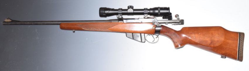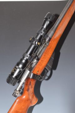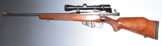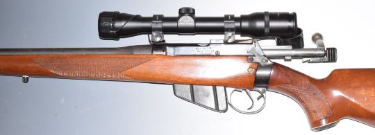 Enfield No.4 Mk.I Long Branch .303 bolt-action rifle with chequered semi-pistol grip and forend, raised cheek piece, five shot magazine, sling mounts, Nikko Stirling Gold Crown Deluxe 4x32 scope and 22 inch barrel, dated 1942, overall length 108cm, serial number 12L4871. PLEASE NOTE THAT A VALID RELEVANT FIREARMS/SHOTGUN CERTIFICATE IS REQUIRED TO HANDLE/PURCHASE THIS ITEM.