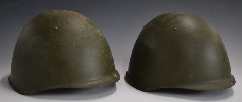 Two Russian steel helmets, one stamped 268511, the other 213122, both with liner and chinstrap