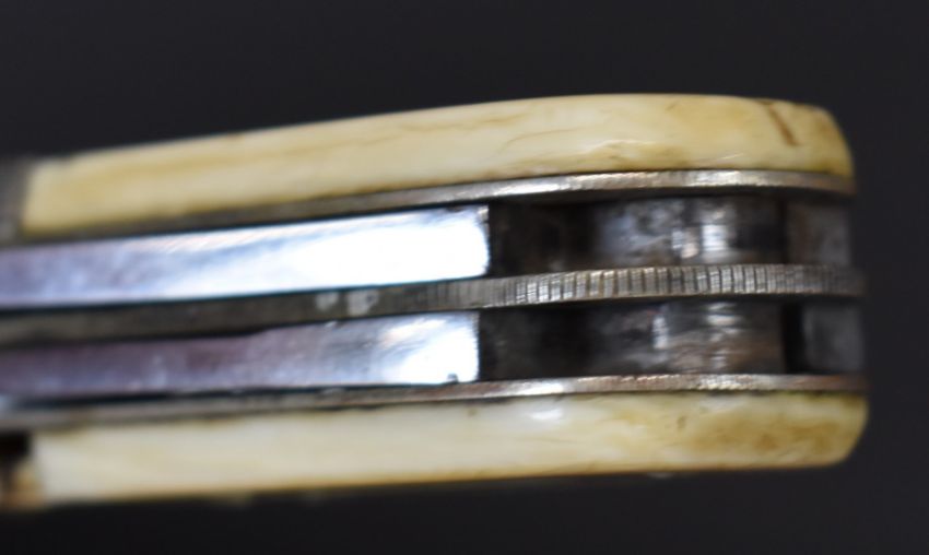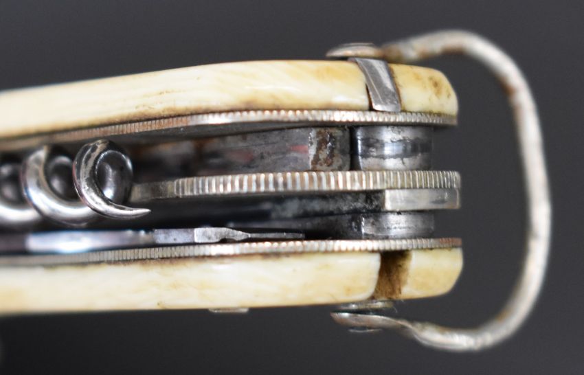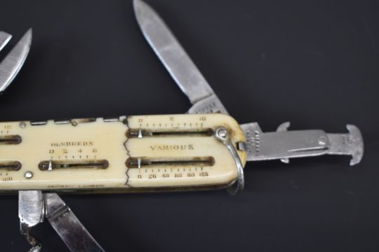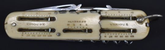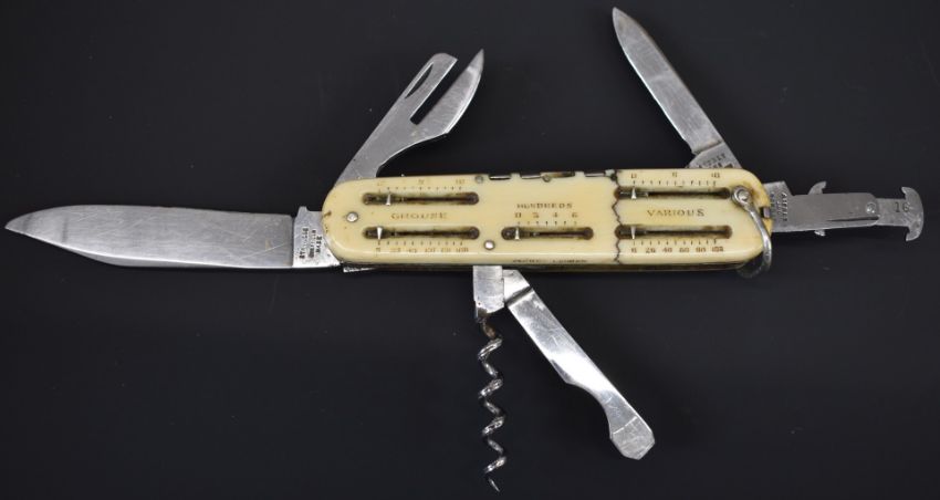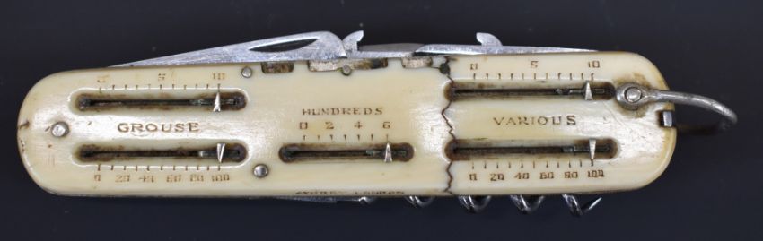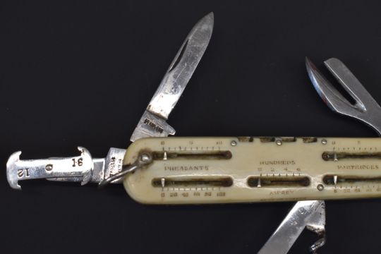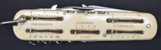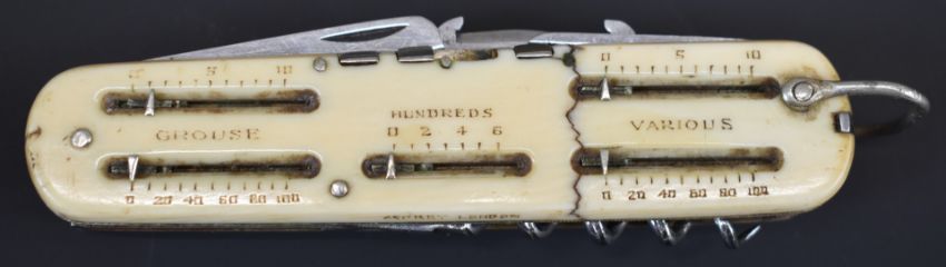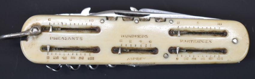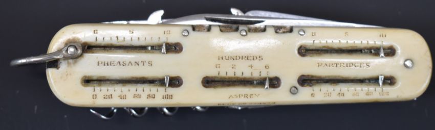 Asprey of London pocket multi-tool with butt markers, game counters for pheasants, partridges, grouse and various, 12 and 16 bore cartridge extractor, corkscrew, two knives, bottle opener, large screwdriver and belt loop, marked 'Asprey London' and 'Regd No 774524' to the facets of the ivory covers, 11cm long.