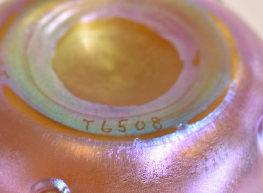 Louis Comfort Tiffany favrile glass bowl and plate in iridescent gold with notched decoration to the body and base of plate, marked LCT, bowl numbered T6508, 11cm diameter, plate numbered T6555, 15cm diameter.