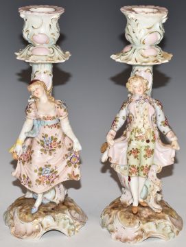 Pair of Continental porcelain figural candlesticks, H19.5cm