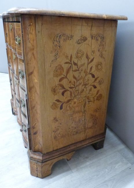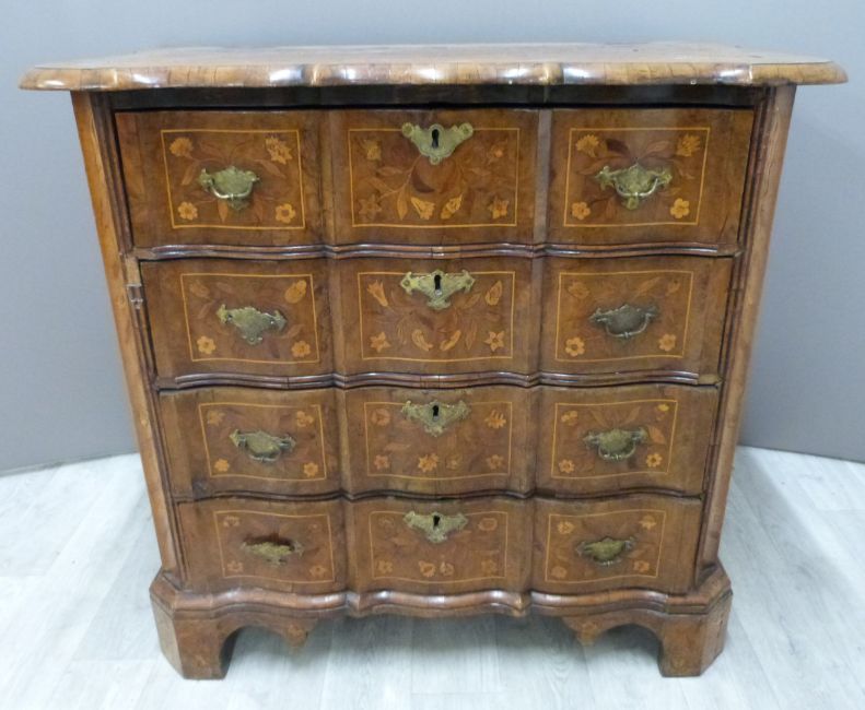 18thC Dutch marquetry inlaid serpentine fronted chest of four drawers with removable mirror, raised on bracket feet, W85 x D50 x H82cm, height with mirror 152cm