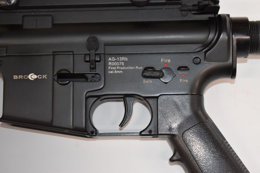 Brocock AR-13RB 6mm take down airsoft gun with pistol-grip, scope rail and tactical stock, serial number R00076.