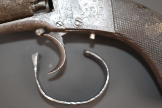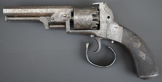 Webley style 120 bore six-shot open framed percussion revolver with engraved frame, chequered grips and 4.25\inch octagonal barrel, overall length 26.5cm.