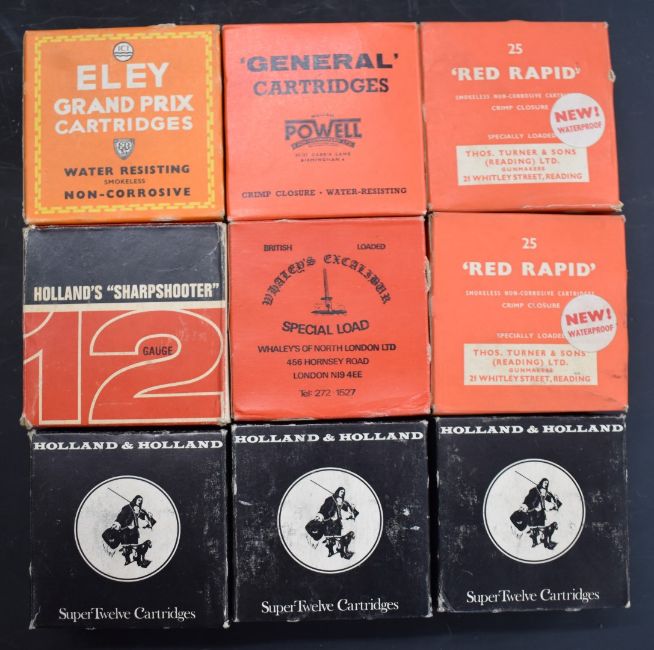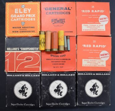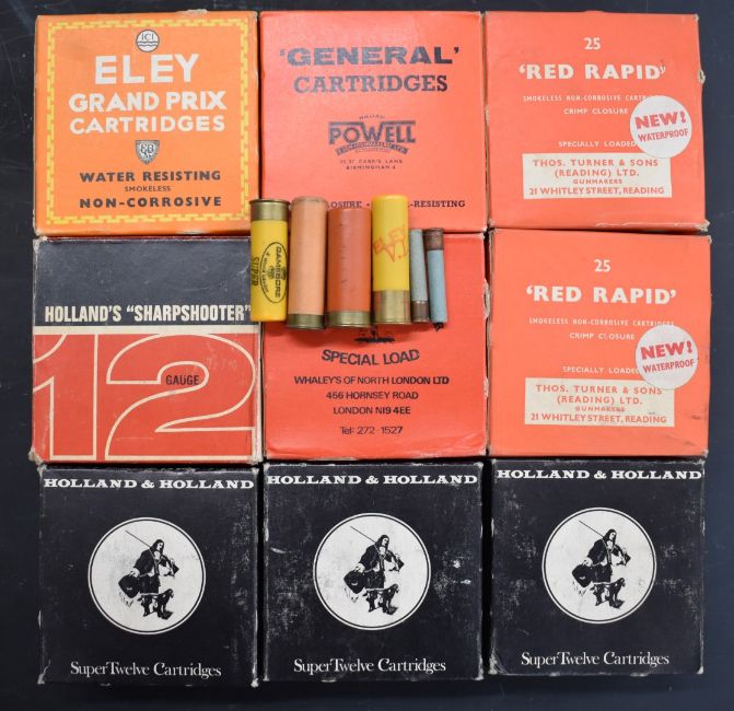 Over 200 collectable mainly 12 bore shotgun cartridges including Holland & Holland Super Twelve, Thomas Turner & Sons Red Rapid, Holland's Sharpshooter, Whaley's Excalibur Special Load, William Powell General, pin-fire, Eley The Nitrone, Parson's Special Loading, Extra Deep Gastight Metal Lined etc, most in original boxes.PLEASE NOTE THAT A VALID RELEVANT FIREARMS/SHOTGUN CERTIFICATE IS REQUIRED TO HANDLE/PURCHASE THIS ITEM.We are not able to offer our usual postage service for this lot