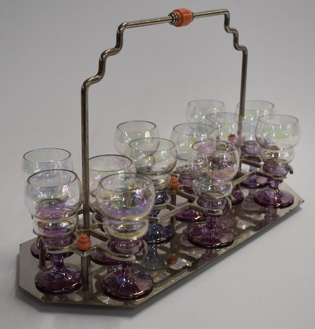 Art Deco kitsch plated drinks stand with 12 glasses, 20cm tall.