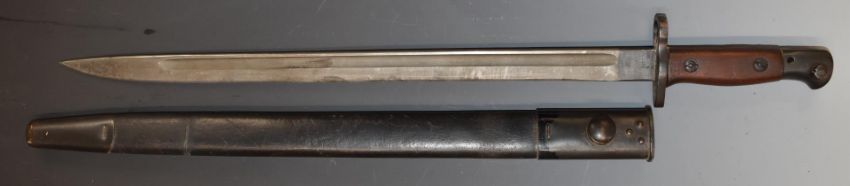 WW1 British 1907 pattern bayonet, some clear stamps to ricasso, regimental stamps 2/7 QRR (Queen's Royal Regiment) with 43cm blade and scabbard