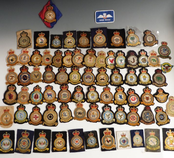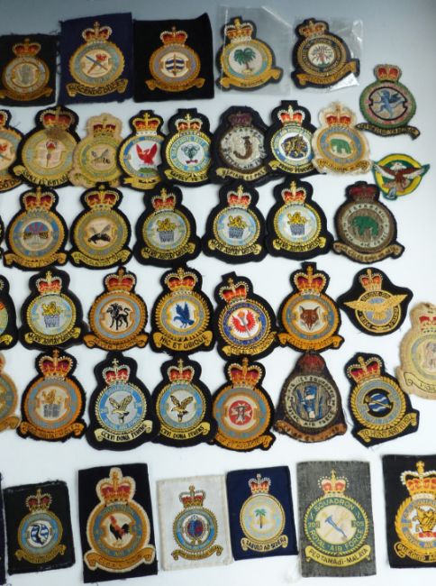 Seventy-four Royal Air Force cloth squadron badges and insignia, including 12 Bomber Squadron, 27 Squadron, 7 Squadron, Royal Air Force Parachute Test Unit, 213 Squadron and 101 Squadron etc