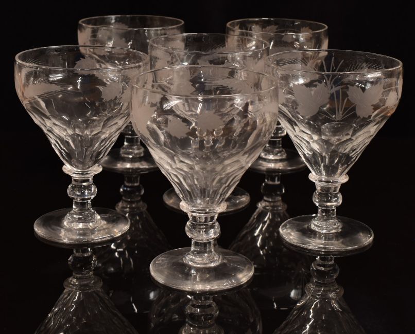 A set of six clear cut glass ale glasses with engraved decoration of barley and hops, raised on knopped stems, 15cm tall.