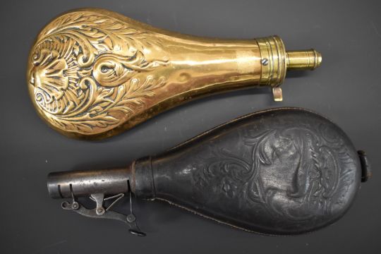 Copper and brass powder flask together with a leather shot flask, both with embossed decoration to both sides, largest 22cm long.