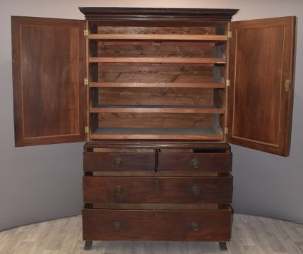 A 19thC mahogany linen press with three graduated drawers, W103 x D60 x H207cm