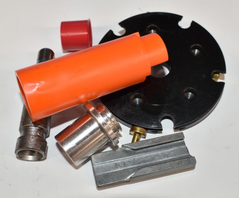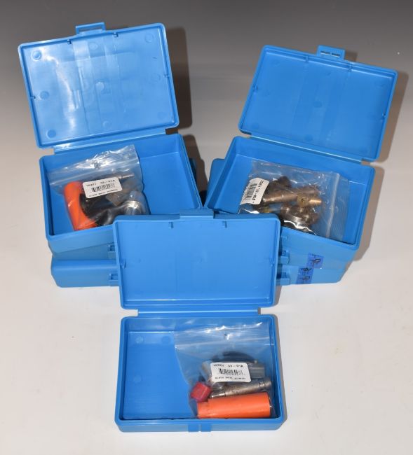 Seven Dillon Precision re-loading conversion kits including .45 ACP, .270 WSM/7mm, .38/.357, all in plastic boxes.