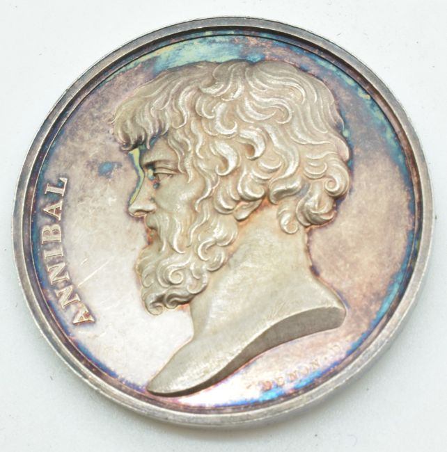 A white metal Napoleon coin / medal by Denon, with profile of Annibal verso, diameter 4cm