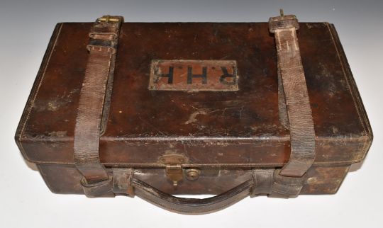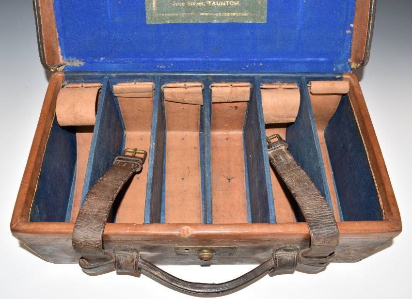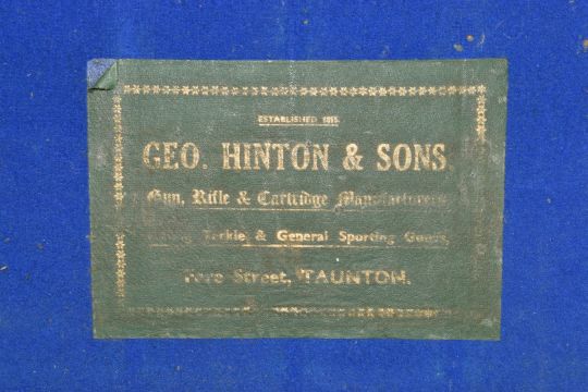 George Hinton & Sons leather bound shotgun cartridge carry case with brass fitting and original label 'Geo Hinton & Sons Gun, Rifle & Cartridge Manufacturer Fishing Tackle & General Sporting Goods, Fere Street, Taunton', 47x26.16.5cm.