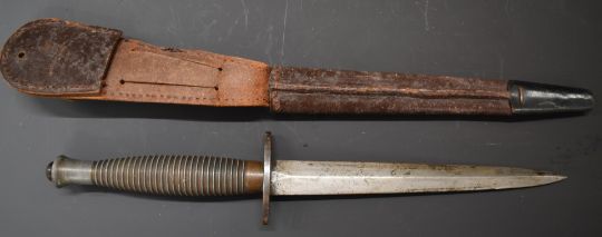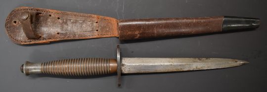 Fairbairn Sykes pattern fighting knife with 'F + S Fighting Knife' etched to one side of the ricasso and Wilkinson Sword to the other, 17cm blade and leather scabbard