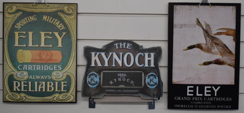 Three modern shotgun cartridge shop display or advertising boards The Kynoch, Sporting Military Eley Cartridges and Eley Grand Prix Cartridges, largest 41x27.5cm.