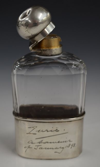 Victorian hallmarked silver cut glass hip flask with bayonet cap, slide off cup and Grand Tour engraving 'Zurich, a Souvenir of January 1898', London 1893, maker W & G Neal, height 13cm