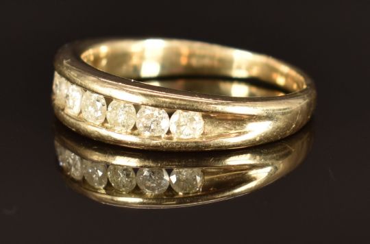 A 9ct gold ring set with nine round cut diamonds, size V, 5.4g