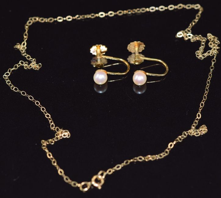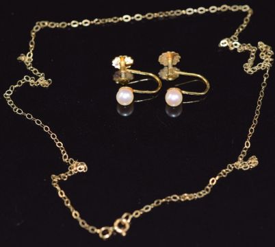 A pair of 9ct gold earrings set with a pearl to each and a 9ct gold chain, 1.4g