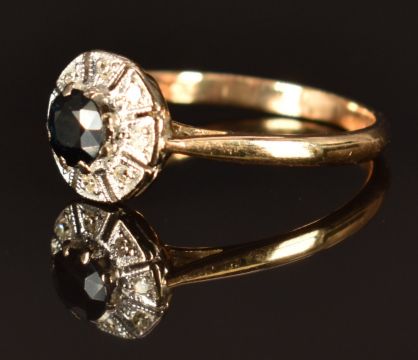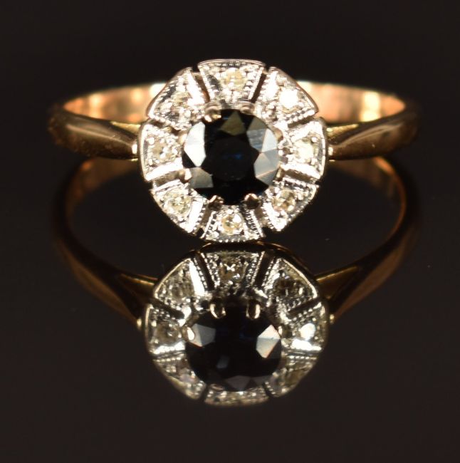 An 18ct gold ring set with a sapphire surrounded by diamonds in a platinum setting, size O, 2.7g