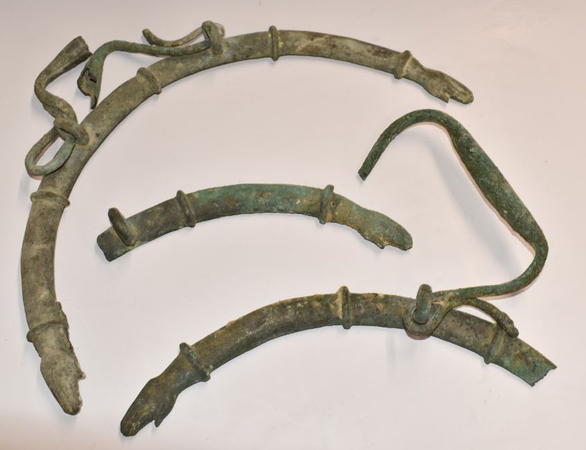 A pair of Roman bronze handles with hand finials and swivel grips, one with mythical creature finial, the backs with two rivets still present, perhaps chariot or situra handles, found Ronda Malaga, Spain, W42cm