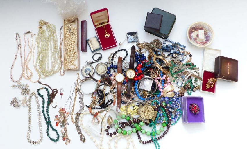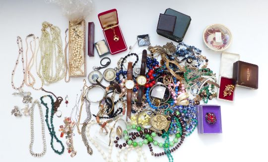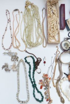 A collection of jewellery including pearl necklaces, silver chain, malachite necklace, rose quartz necklace, silver and paste brooch, filigree brooch, etc