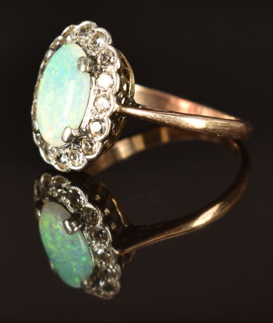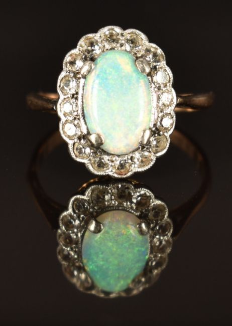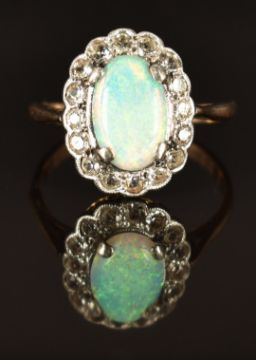 A 9ct gold ring set with an opal and white sapphires, size K, 2.3g