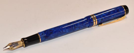 Parker Duofold fountain pen with blue marbled shaft and cap, gold plated fittings and signed 18ct gold nib, in original box.