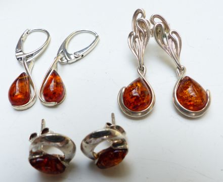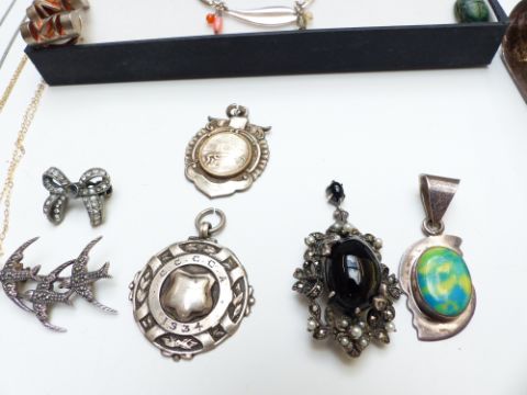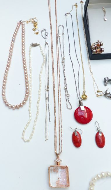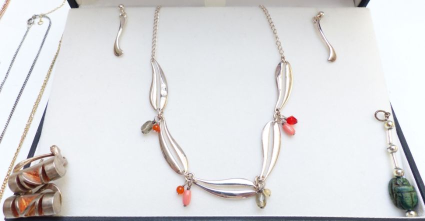 A collection of silver jewellery including bracelet, pendants, earrings, pearl necklace, locket, Egyptian scarab pendant, silver fob, silver tongs, etc