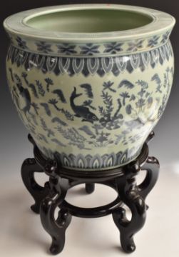 Chinese contemporary blue and white porcelain jardinière or fish bowl on hardwood stand, D45.5 x H41cm, stand H24cm
