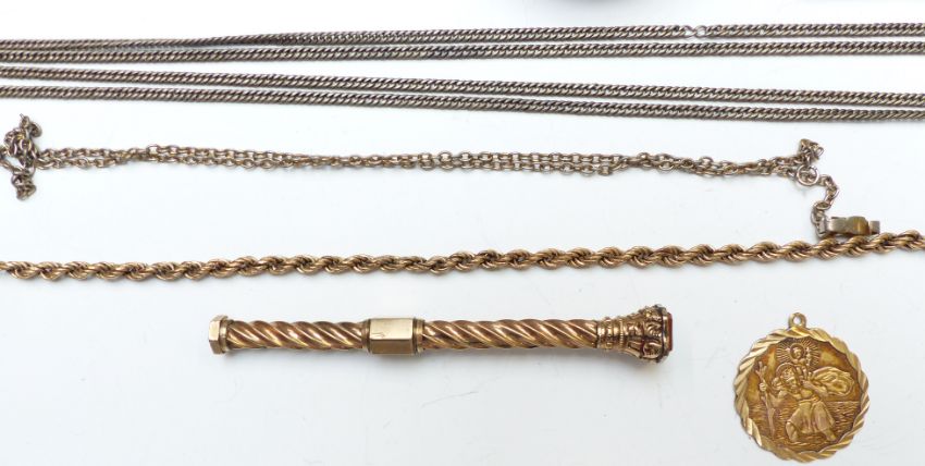 A 9ct gold rope twist bracelet, a 9ct gold St Christopher (4.9g), compacts, silver chain, rolled gold pencil, etc