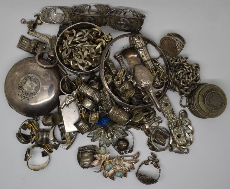 A collection of silver jewellery including curb link necklace, filigree bracelet and brooch, charms, pocket watch case, bangle, rings, Albert, etc