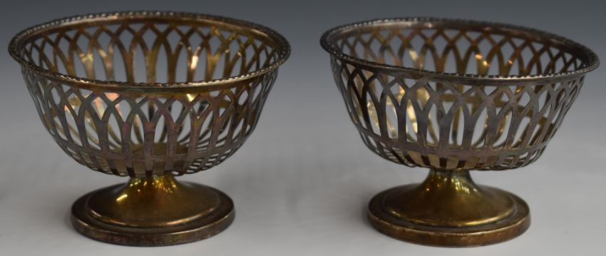 George V pair of hallmarked silver pedestal bon bon dishes with pierced decoration, Birmingham 1910 and Sheffield 1910, makers Cooper Brothers & Sons Ltd and E S Barnsley & Co, diameter 9cm, weight 203g