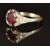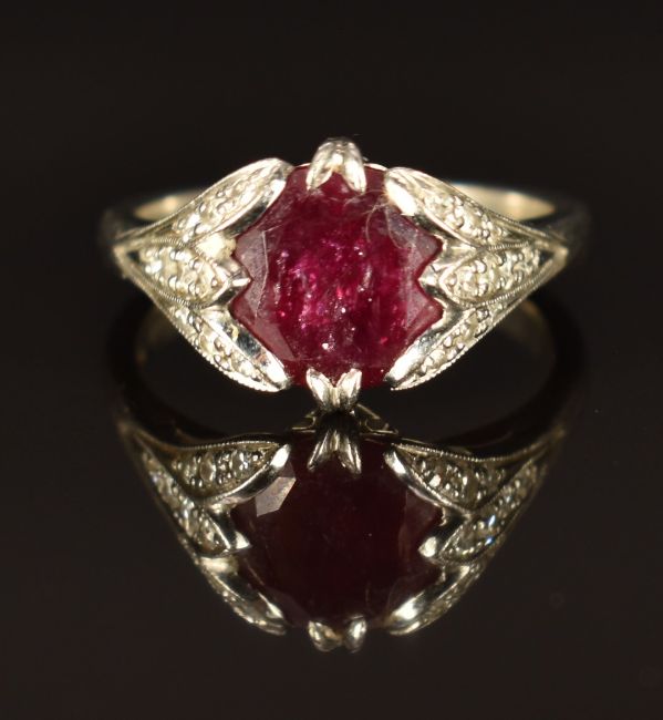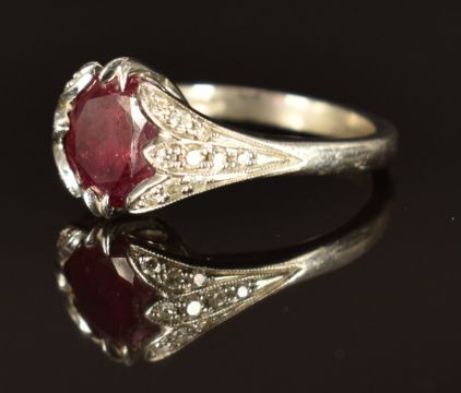 A platinum ring set with a round cut ruby and with diamonds to the shoulders, size K/L, 6.9g