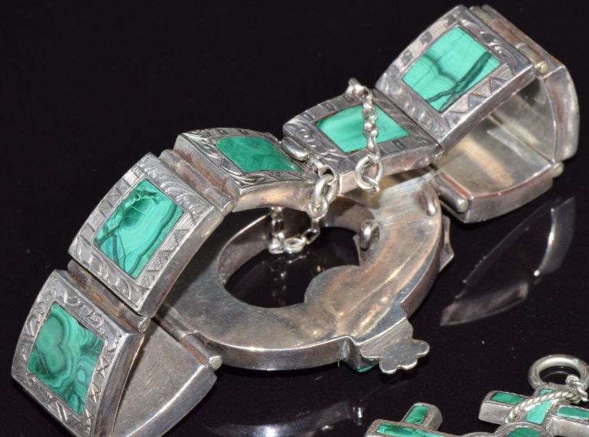 Victorian silver bracelet set with malachite, Victorian silver brooch set with malachite in the form of an anchor, cross and heart with a similar ring