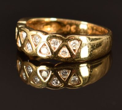 An 18ct gold ring set with diamonds totalling approximately 0.2ct, size M, 5.4g