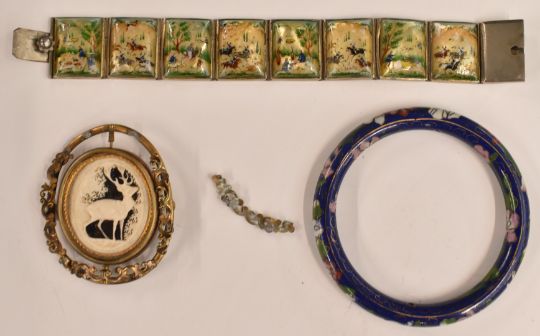 A white metal bracelet set with painted mother of pearl panels, a cloisonné bangle and a Victorian pinchbeck brooch