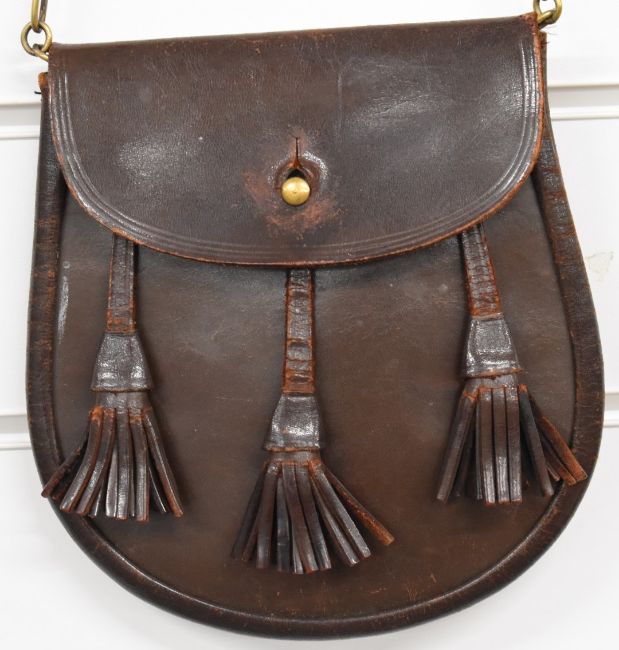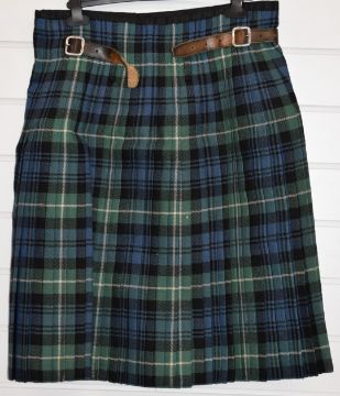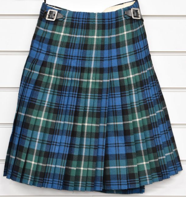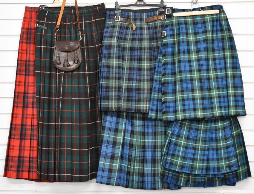 Seven kilts and kilted skirts in various tartans and a leather sporran