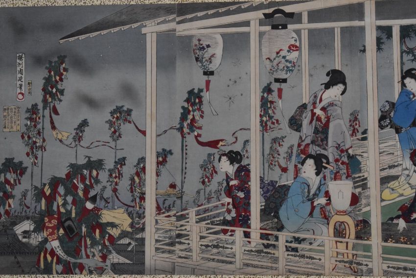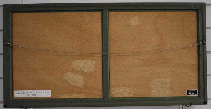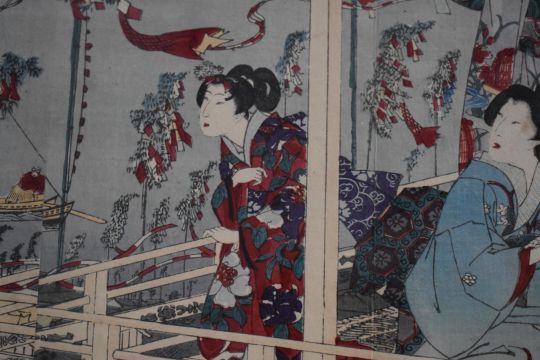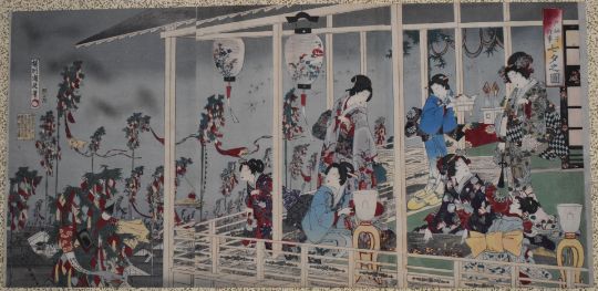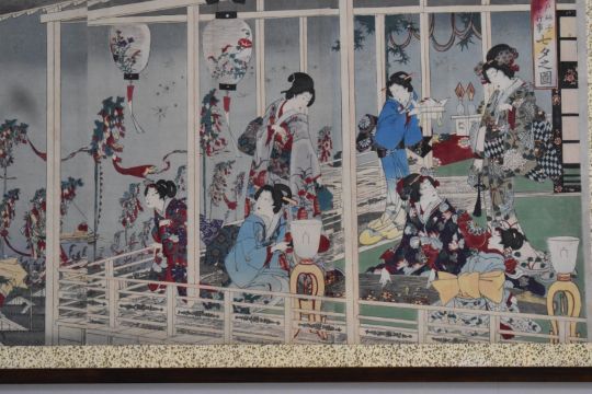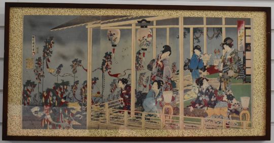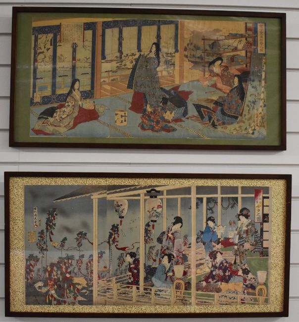 Pair of Japanese Meiji period tryptych woodblock prints, by repute ex Roland Sonderhoff collection, 36 x 72cm
