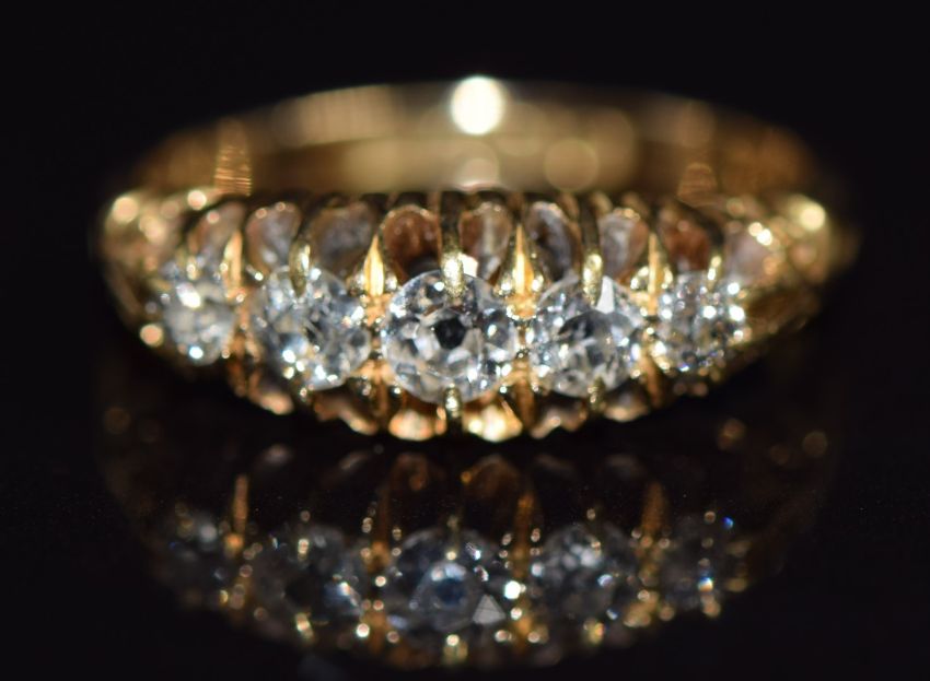 An 18ct gold ring set with five old cut diamonds, Birmingham 1911, size L/M, 3.5g