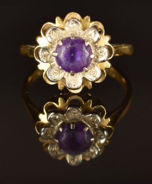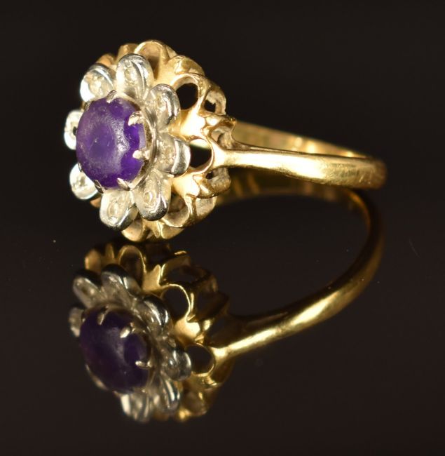 An 18ct gold ring set with an amethyst and diamonds in a flower setting, size J, 3.9g