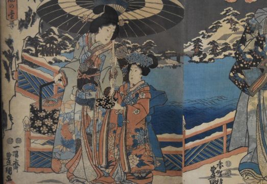 Japanese Meiji period triptych woodblock print of ladies with parasols promenading, 36 x 73cm