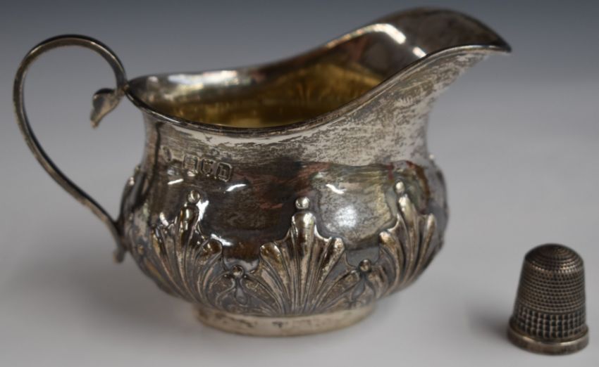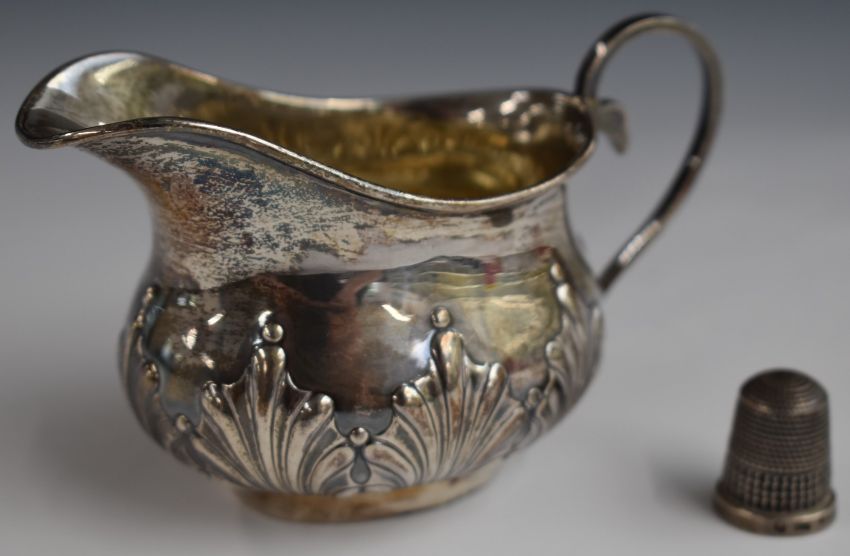 Edward hallmarked silver cream jug London 1903, maker William Hutton & Sons Ltd, length 10.5cm, together with a hallmarked silver thimble, weight of both 74g