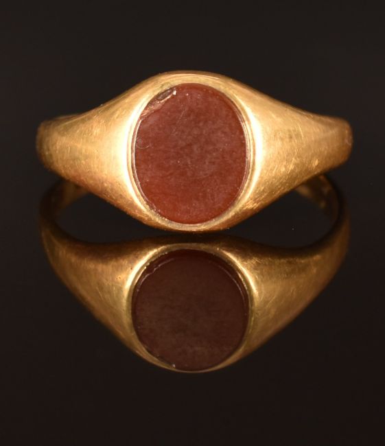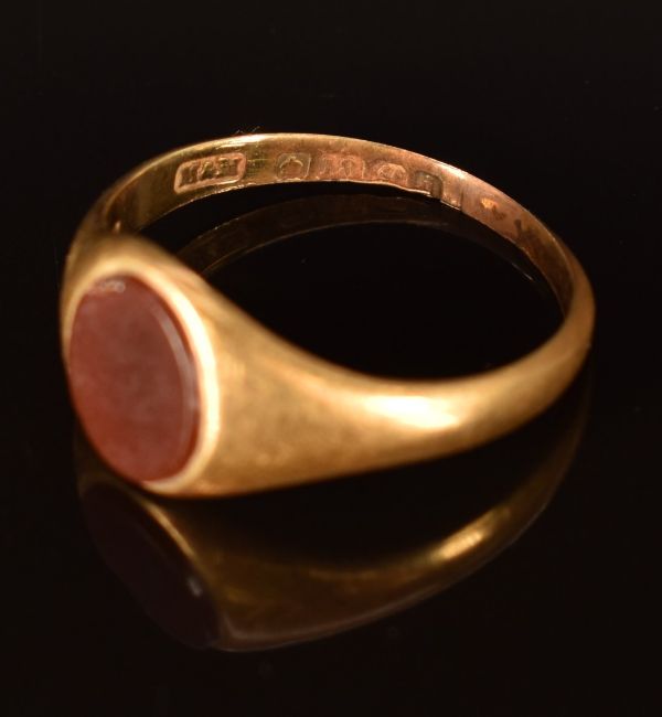 An 18ct gold signet ring set with agate, Birmingham 1909, size P, 3.2g