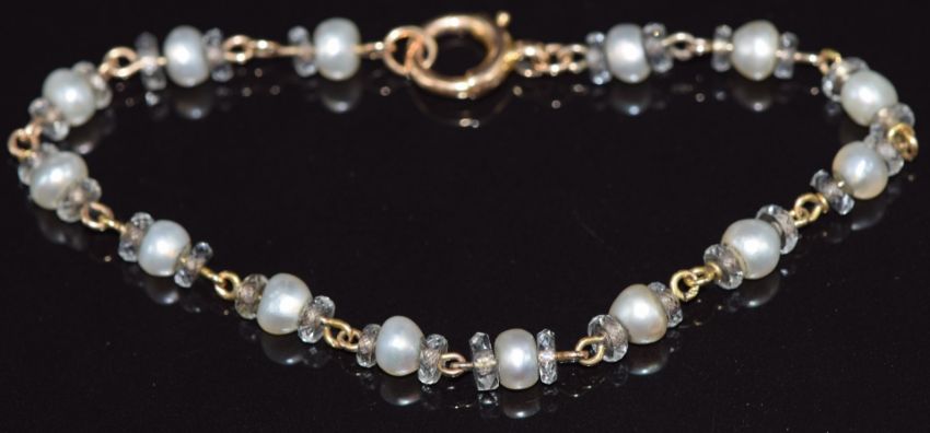 Art Deco 9ct gold bracelet made up of pearls and faceted crystal beads, 7.7g