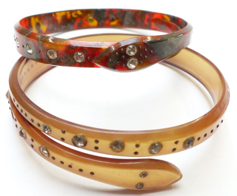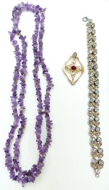 Two Art Deco snake bangles, amethyst necklace, pearl necklace, paste ring, etc