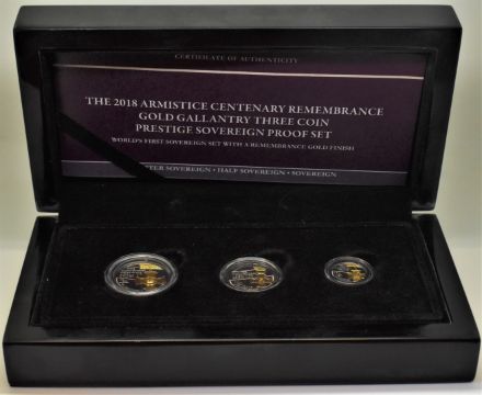 2018 Armistice Centenary three coin gold sovereign proof set comprising full, half and quarter sovereigns, layered with ruthenium, darkening the look and highlighting the medal design reverse